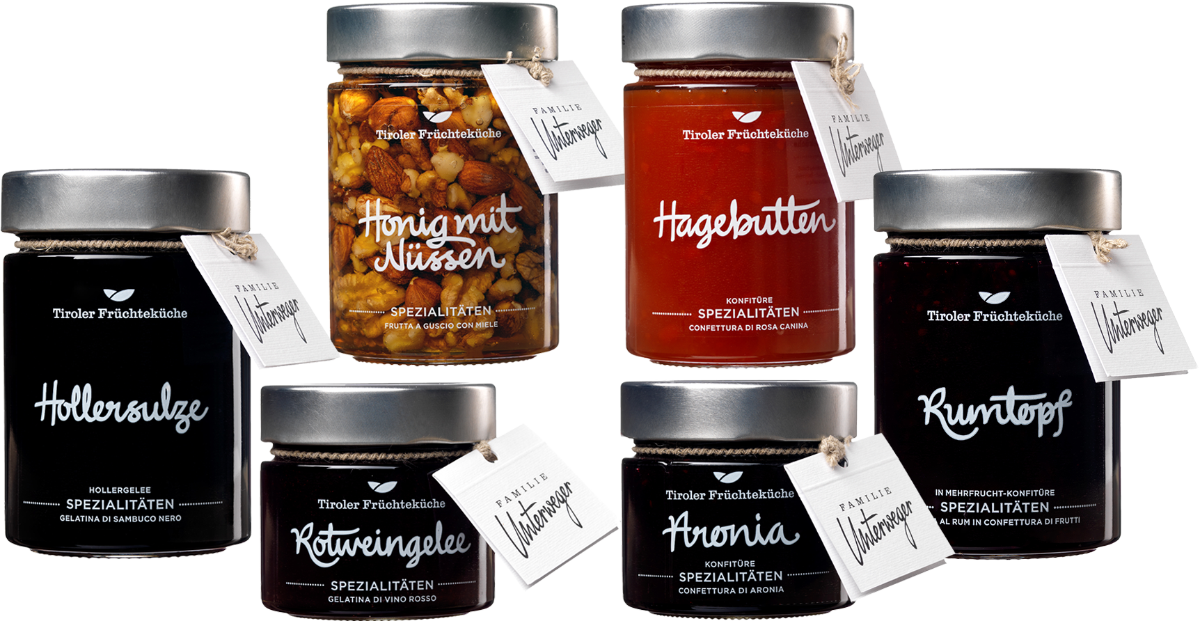 Neben den klassischen Konfitüren, welche in Verpackungseinheiten von 28 g bis 13,5 kg erhältlich sind, hat die Firma Unterweger Früchteküche ein breites Sortiment an unterschiedlichen Spezialitäten wie zB Hollersulze, Rumtopf, Honignüsse und Hagebuttenkonfitüre, Aronia und Rotweingelee. Bei den Spezialitäten der Unterweger Früchteküche handelt es sich um Produkte, die nach traditionellen Rezepturen und bewährten Herstellungsverfahren produziert werden.